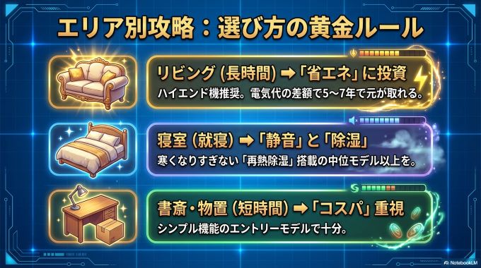 基本は、使用する部屋の用途(リビングとかランドリールームなど)と畳数そして使用頻度!