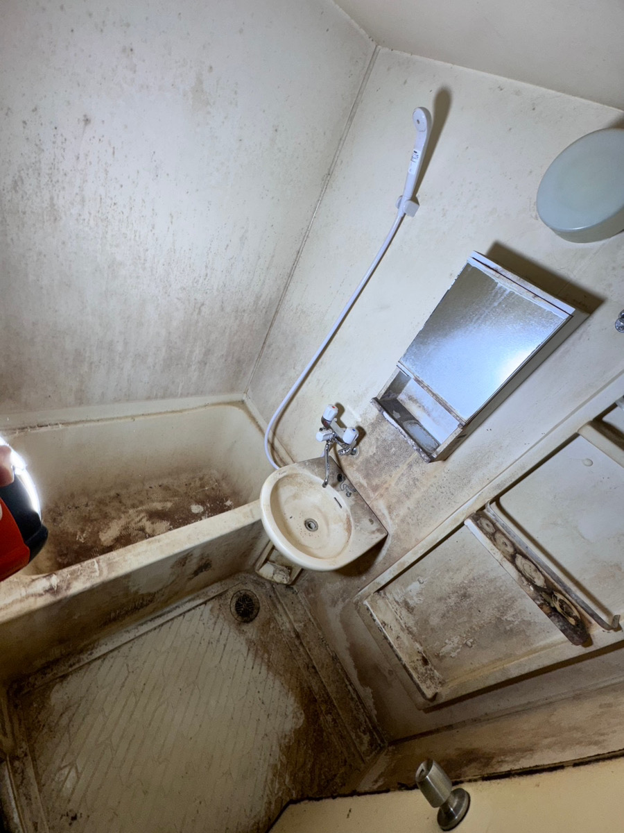 浴室のエプロン内部: 浴槽の側面カバー(エプロン)を外した奥は、石鹸カスや皮脂、カビのヘドロ状の温床です。